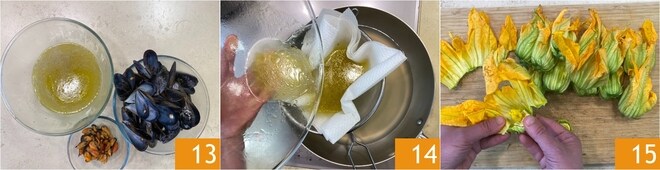 Réservez les moules 13 et filtrez le liquide avec du papier absorbant de cuisine, en le recueillant dans une grande poêle 14. Nettoyez les fleurs de courgette en éliminant le pistil central 15.