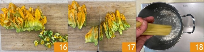 Ne conservez que les pétales 16 et coupez-les en fines lanières 17. Pendant ce temps, faites cuire les linguine dans de l'eau salée pendant 4 minutes 18.