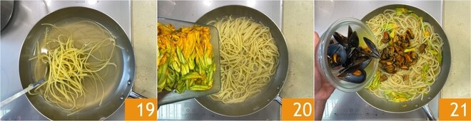 Chauffez le liquide des moules et ajoutez-y les linguine 19, salez, poivrez et poursuivez la cuisson des pâtes. Presque à la fin de la cuisson, ajoutez les fleurs de courgette 20 et les moules, à la fois entières et décortiquées 21.
