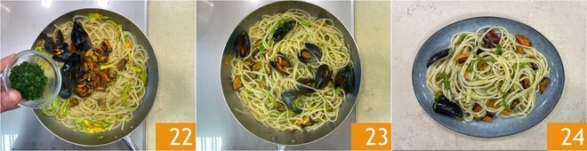 Assaisonnez avec le persil haché 22, le poivre et un filet d'huile d'olive. Mélangez 23 et servez bien chaudes les linguine moules et fleurs de courgette 24.