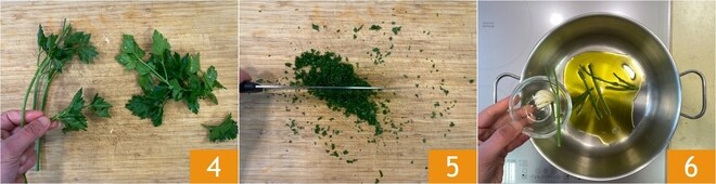 Séparez les tiges des feuilles du persil 4 et hachez ces dernières 5. Dans une grande casserole, versez l'huile, les tiges de persil et l'ail 6, laissez infuser pendant 1 à 2 minutes.