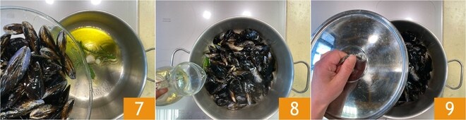 Ajoutez les moules 7 et déglacez avec le vin blanc 8. Couvrez avec un couvercle 9 et laissez cuire à feu moyen-vif pendant 3-4 minutes. Remuez la casserole de temps en temps.