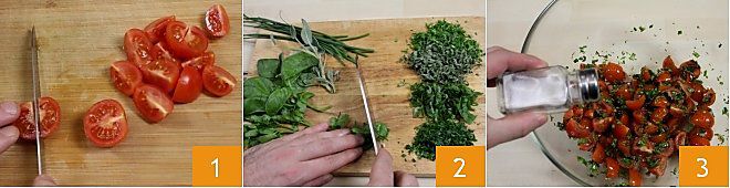 Pour préparer les linguine avec des herbes mixtes, tomates cerises et huile épicée, commencez par laver soigneusement les tomates cerises et coupez chaque tomate cerise en quatre quartiers. Nettoyez ensuite les herbes et hachez-les finement avec un couteau ou une demi-lune 2 (pour plus de détails, consultez la École de cuisine : Comment couper les légumes). Placez dans un grand saladier les tomates cerises avec les herbes, mélangez et salez.