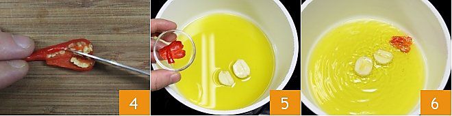Prenez maintenant le piment, ouvrez-le et retirez les graines avec l'aide d'un petit couteau 4. Faites chauffer l'huile avec deux gousses d'ail pelées et le piment 5. Lorsque l'huile commence à former des petites bulles, éteignez le feu 6.
