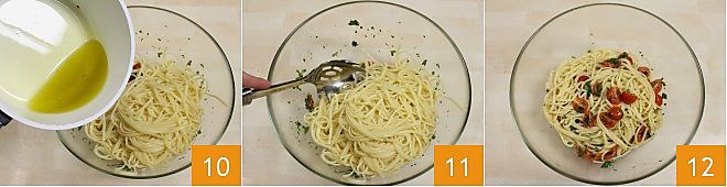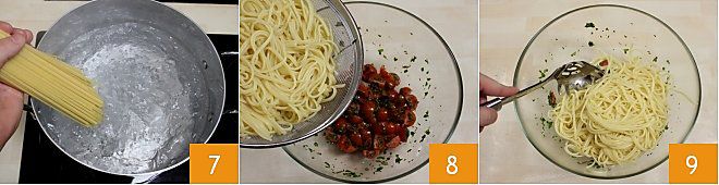 Faites cuire les bavettes dans une grande quantité d'eau salée 7 et, une fois cuites, égouttez bien les pâtes 8. Ajoutez les bavettes aux tomates cerises et aux herbes dans le saladier, puis mélangez soigneusement 9.
