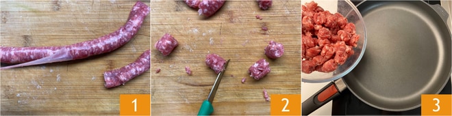 Pour préparer les linguine avec saucisse, poireaux et fenouil, commencez par retirer la peau de la saucisse 1 et coupez-la grossièrement en morceaux 2. Versez la saucisse dans une poêle antiadhésive bien chaude et faites-la dorer 3.
