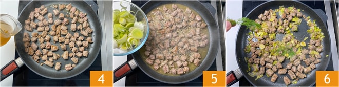 Mouillez avec la bière 4 et laissez évaporer la partie alcoolique, puis ajoutez les poireaux coupés en rondelles 5 et le fenouil 6. Continuez la cuisson pendant une dizaine de minutes, jusqu'à ce que les poireaux soient dorés.
