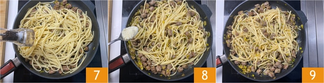 Entre-temps, faites cuire les linguine dans de l'eau bouillante salée. Égouttez les pâtes al dente et transférez-les dans la poêle. Poivrez 7, ajoutez le Parmigiano Reggiano AOP râpé 8 et faites sauter le tout brièvement. Vos linguine avec saucisse, poireaux et fenouil sont prêtes à être dégustées 9 !