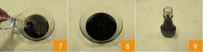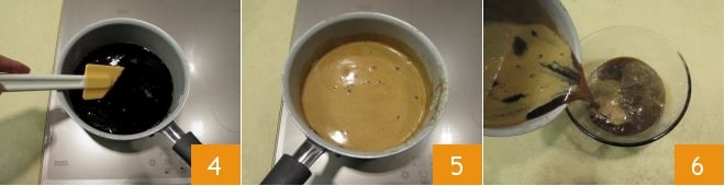 Pour faciliter l'opération, vous pouvez mélanger avec une spatule 4 ou avec une cuillère en bois. Quand le sucre sera totalement fondu 5, versez le mélange dans un bol pour le refroidir 6.