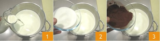 Pour préparer la liqueur au chocolat, commencez par réunir le lait et la crème dans une grande casserole 1. Ajoutez le sucre 2 et commencez à chauffer le mélange. Ajoutez également le cacao 3
