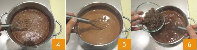 En commençant immédiatement à mélanger avec le fouet pour éviter la formation de grumeaux 4. Continuez à remuer avec le fouet et portez doucement à ébullition 5. Laissez mijoter environ 10 minutes, en continuant de mélanger ; puis ajoutez le chocolat grossièrement haché 6