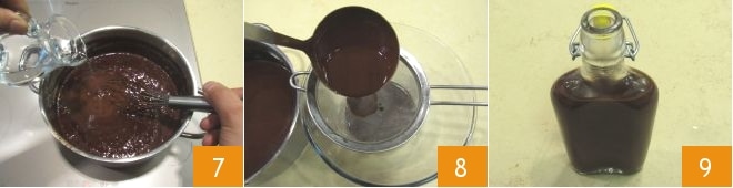 Mélangez soigneusement jusqu'à ce qu'il fonde, éteignez le feu et laissez tiédir. Ajoutez enfin l'alcool 7, et mélangez-le soigneusement aussi. Filtrez le mélange à travers un tamis fin 8, pour éviter d'éventuels grumeaux résiduels. Une fois complètement refroidi, répartissez la liqueur au chocolat dans des bouteilles propres et complètement sèches 9. Fermez hermétiquement les bouteilles, conservez-les au réfrigérateur et laissez mûrir la liqueur pendant 20-30 jours avant de la consommer, afin que le goût de l'alcool soit plus doux et moins envahissant. Agitez la liqueur avant de la consommer.