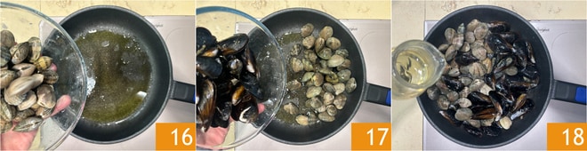 Entre-temps, dans une poêle, versez un filet d'huile et ajoutez les palourdes 16 et les moules 17, lorsqu'elles sont ouvertes, déglacez avec le vin blanc 18. Faites évaporer toute la partie alcoolique.