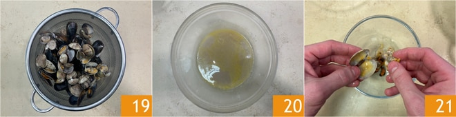 Filtrez le tout 19 et réservez l'eau de cuisson 20. Décortiquez les moules et les palourdes 21 mais gardez-en quelques-unes avec la coquille pour le dressage final.