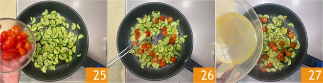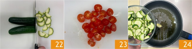 Coupez les courgettes en demi-lunes 22 et les tomates cerises en deux 23. Dans une poêle, versez un filet d'huile, ajoutez une gousse d'ail et faites revenir pendant quelques minutes, puis ajoutez les courgettes 24 et faites-les dorer pendant quelques minutes, jusqu'à ce qu'elles soient dorées.