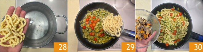 Cuisez les lorighittas dans une grande quantité d'eau bouillante salée pendant 4-5 minutes 28, égouttez-les et transférez-les dans la poêle 29. Ajoutez les moules et les palourdes 30 et faites sauter pendant quelques minutes.