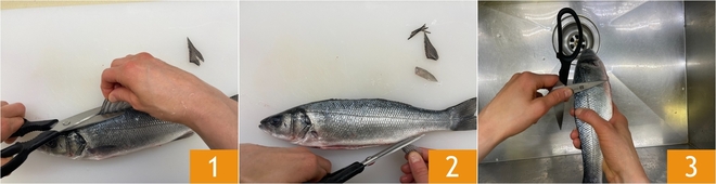 Pour préparer le bar à la friteuse à air, commencez par le Comment nettoyer le bar (loup de mer). Coupez les nageoires latérales 1 et la dorsale 2, incisez le ventre, évidez-le et retirez les écailles sous l'eau courante 3.
