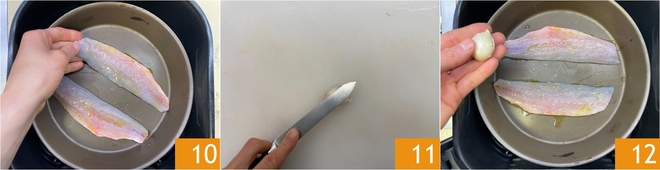Munissez-vous d'un plat adapté à la friteuse à air (d'une capacité de 6 L) et disposez-y 2 filets assaisonnés à la fois, ou plus selon la capacité de votre panier 10. Écrasez une gousse d'ail 11 et ajoutez-la dans le plat 12.