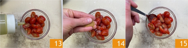 Coupez les tomates datterino et assaisonnez-les dans un bol avec de l'huile d'olive extra vierge 13, du sel et du sucre muscovado 14. Mélangez pour bien amalgamer les ingrédients 15.