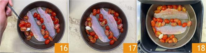 Ajoutez 1/4 des tomates dans le plat 16, en évitant de les superposer sur les filets 17. Réglez maintenant la température de la friteuse à air à 170 degrés et insérez le panier 18.
