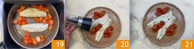 Faites cuire pendant 7 minutes 19, ou jusqu'à ce que le bar soit cuit et que les tomates soient juteuses 19. Juste avant de servir, parfumez avec du poivre noir 20. Le bar à la friteuse à air est prêt à être servi 21.
