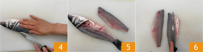 Maintenant, avec un couteau bien aiguisé, coupez le long du dos du bar 4 : vous obtiendrez ainsi le premier filet 5. Désarêtez et découpez également l'autre filet, puis éliminez les parties les plus grasses 6 en gardant la peau.