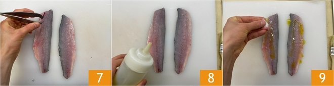 Avec une pince à arêtes, assurez-vous d'enlever toutes les arêtes présentes dans le filet 7. Assaisonnez avec l'huile d'olive extra vierge 8 et une pincée de sel 9. Avec 4 bars vous obtiendrez 2 filets par portion.