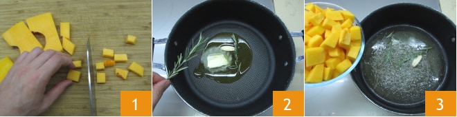 Pour préparer les lumaconi avec potiron et caciocavallo, commencez par mettre sur le feu une casserole d'eau pour la cuisson des pâtes à saler à ébullition, puis nettoyez le potiron et coupez-le en dés 1 : vous devrez obtenir au total environ 530 g de chair. Dans une casserole, faites fondre le beurre avec l'huile, l'ail et les brins de romarin 2, puis ajoutez le potiron 3.