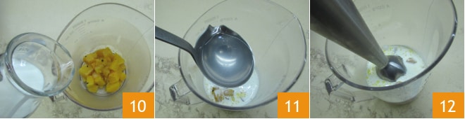 Pendant ce temps, prélevez une portion de potiron de la poêle et transférez-la dans un récipient haut et étroit, ajoutez la crème 10 et une louche de l'eau de cuisson des pâtes 11 et mixez avec un mixeur plongeant pour obtenir une crème homogène 12.