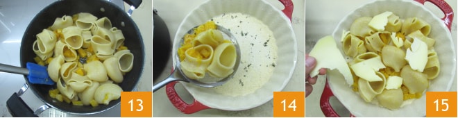 Une fois le temps de cuisson écoulé, égouttez les lumaconi et ajoutez-les au potiron restant dans la poêle, en mélangeant bien 13. Maintenant, transférez la moitié des lumaconi ainsi assaisonnés dans le plat 14 et répartissez dessus la moitié du caciocavallo en tranches 15.