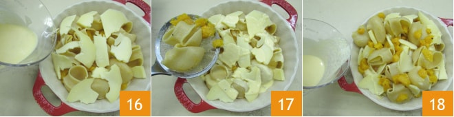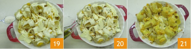Versez également la moitié de la crème de potiron 16 et répétez les couches en ajoutant les coquilles restantes 17, le reste du caciocavallo et la crème restante 18.