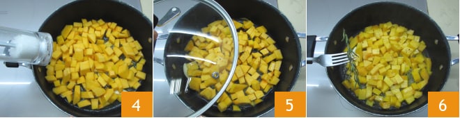 Salez 4, poivrez, couvrez avec le couvercle 5 et faites cuire à feu moyen pendant environ 10 minutes. Lorsque le potiron est cuit, retirez l'ail et le romarin de la poêle 6 et réservez.