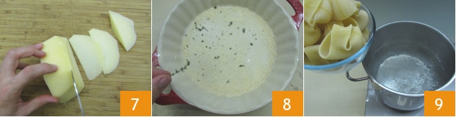 Coupez finement le caciocavallo 7. Beurrez un plat et saupoudrez-le de chapelure et de petites feuilles de thym frais 8. À ce stade, l'eau sera arrivée à ébullition, versez donc les lumaconi 9 et cuisez-les pour la moitié du temps de cuisson indiqué.