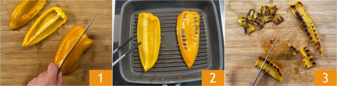 Pour préparer la schiscetta avec couscous et saumon, commencez par les légumes : nettoyez le poivron de ses graines et filaments internes, puis divisez-le en 4 parties dans le sens de la longueur 1. Placez le poivron sur un gril bien chaud et faites-le griller jusqu'à ce que des stries apparaissent 2. Enfin, coupez-le en morceaux d'environ 2 cm 3.