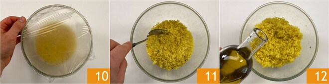 Couvrez avec un film plastique et laissez reposer pendant 5 minutes 10. Après ce temps, l'eau aura été absorbée, alors égrainez le couscous avec une fourchette 11 et assaisonnez avec un filet d'huile 12.
