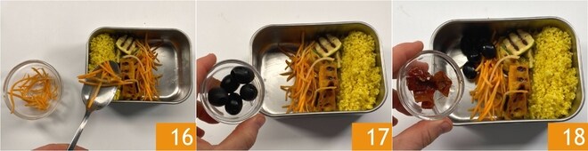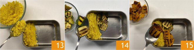 Vous êtes prêt à transférer les ingrédients dans votre schiscetta : le couscous d'un côté 14, puis les courgettes 15 et les poivrons 15.