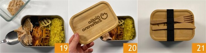 Enfin, ajoutez le saumon grillé 19. Fermez avec le couvercle 20 : votre schiscetta est prête à être transportée… n'oubliez pas de secouer avant de déguster 21 !