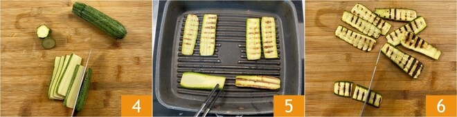 Équeutez les courgettes et coupez-les en tranches d'un demi-centimètre d'épaisseur 4. Grillez également les courgettes 5 et coupez-les en morceaux de la même taille que le poivron 6.
