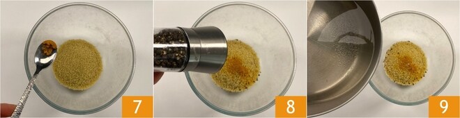 Entre-temps, portez à ébullition une petite casserole d'eau. Mettez le couscous dans un bol et assaisonnez avec du curcuma 7, du sel et du poivre 8. Versez l'eau bouillante jusqu'à couvrir le couscous d'un doigt 9.