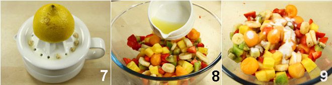 Prélevez le jus d'un citron 7 et ajoutez-le aux fruits 8, ajoutez ensuite le sucre 9 et mélangez encore délicatement. Laissez reposer la macédoine pendant environ une heure.