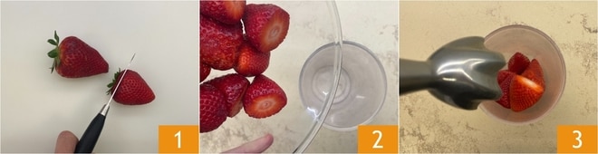 Pour réaliser les madeleines aux fraises, commencez par laver les fraises et retirez la queue 1, puis transférez-les dans un récipient 2 et mixez avec un mixeur plongeant 3.