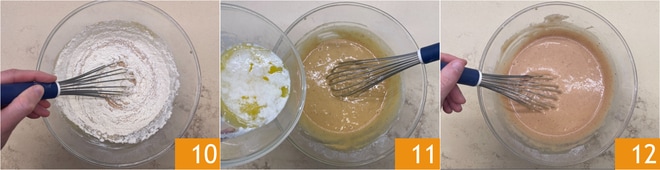 Incorporez les ingrédients secs avec le fouet 10, puis ajoutez le beurre fondu 11 et mélangez le tout 12. Couvrez de film alimentaire et laissez reposer la pâte au réfrigérateur pendant 30 minutes.