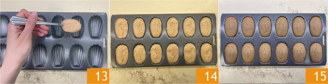 Après ce temps, beurrez le moule à madeleines et remplissez chaque cavité avec une petite cuillerée de pâte 13. Faites cuire au four statique préchauffé à 200°C pendant environ 12 minutes 14. Une fois cuites, sortez le moule du four 15.
