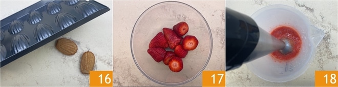 Démoulez les madeleines encore chaudes en tapotant légèrement le moule 16, puis laissez refroidir. Pendant ce temps, préparez le glaçage : équeutez les fraises 17 et mixez-les avec le mixeur plongeant 18.