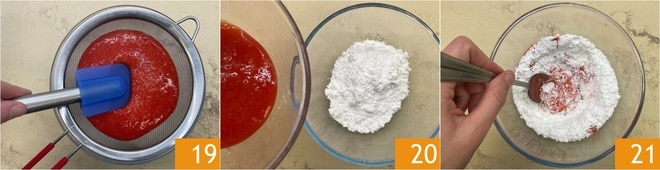 Tamisez la purée avec une passoire pour la rendre lisse et homogène 19, puis ajoutez-la au sucre glace 20 et mélangez le tout 21.