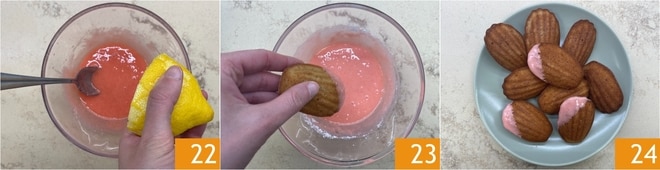 Enfin, ajoutez le jus de citron 22 et mélangez à nouveau. Trempez une extrémité des madeleines dans le glaçage 23 et laissez sécher à température ambiante. Vos madeleines aux fraises sont prêtes à être servies 24 !