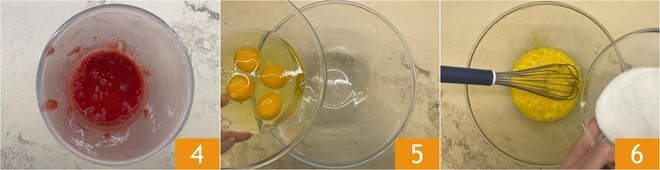 Après avoir préparé la purée de fraises 4, faites fondre le beurre dans une casserole et laissez tiédir. Dans un autre bol, versez les œufs 5 et fouettez-les avec le sucre sans les monter 6.