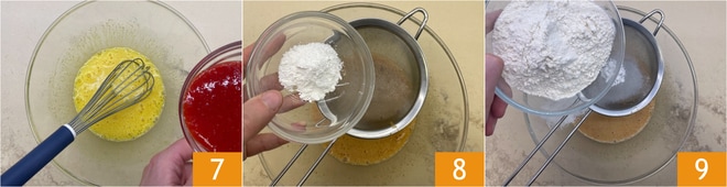 Ajoutez également la purée de fraises 7 et mélangez la préparation avec le fouet. Tamisez la levure 8 et la farine 9 dans le bol.