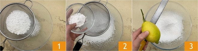 Pour réaliser les madeleines glacées, commencez par faire fondre le beurre dans une casserole et laissez-le tiédir. Pendant ce temps, tamisez le sucre glace 1 et la levure 2 dans un bol, puis ajoutez le zeste râpé du citron 3.