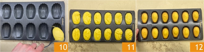 Après le temps de repos, beurrez un moule à madeleines et remplissez-le de pâte à l'aide de 2 cuillères (vous pouvez également utiliser une poche à douille) 10. Ne remplissez pas trop les empreintes car elles vont gonfler à la cuisson 11. Faites cuire les madeleines dans un four statique préchauffé à 180°C pendant 11-12 minutes. Une fois cuites, sortez-les du four et laissez-les refroidir complètement dans le moule 12.
